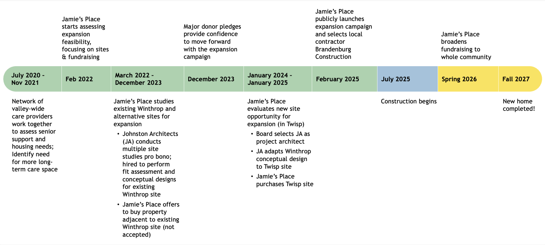 • With a growing, aging population, health care is an economic opportunity for our valley. Following the expansion, Jamie’s Place will spend most of its $1.4 million operating budget locally every year, fueling our economy. As an employer of nearly 30 people, we will stimulate economic development that will benefit the entire valley and county. We expect 80% of the $20 million in construction costs to be spent in the Methow Valley, supporting local businesses. Further, Jamie’s Place’s quality care enables families to remain in the workforce when they would otherwise have to care for loved ones.